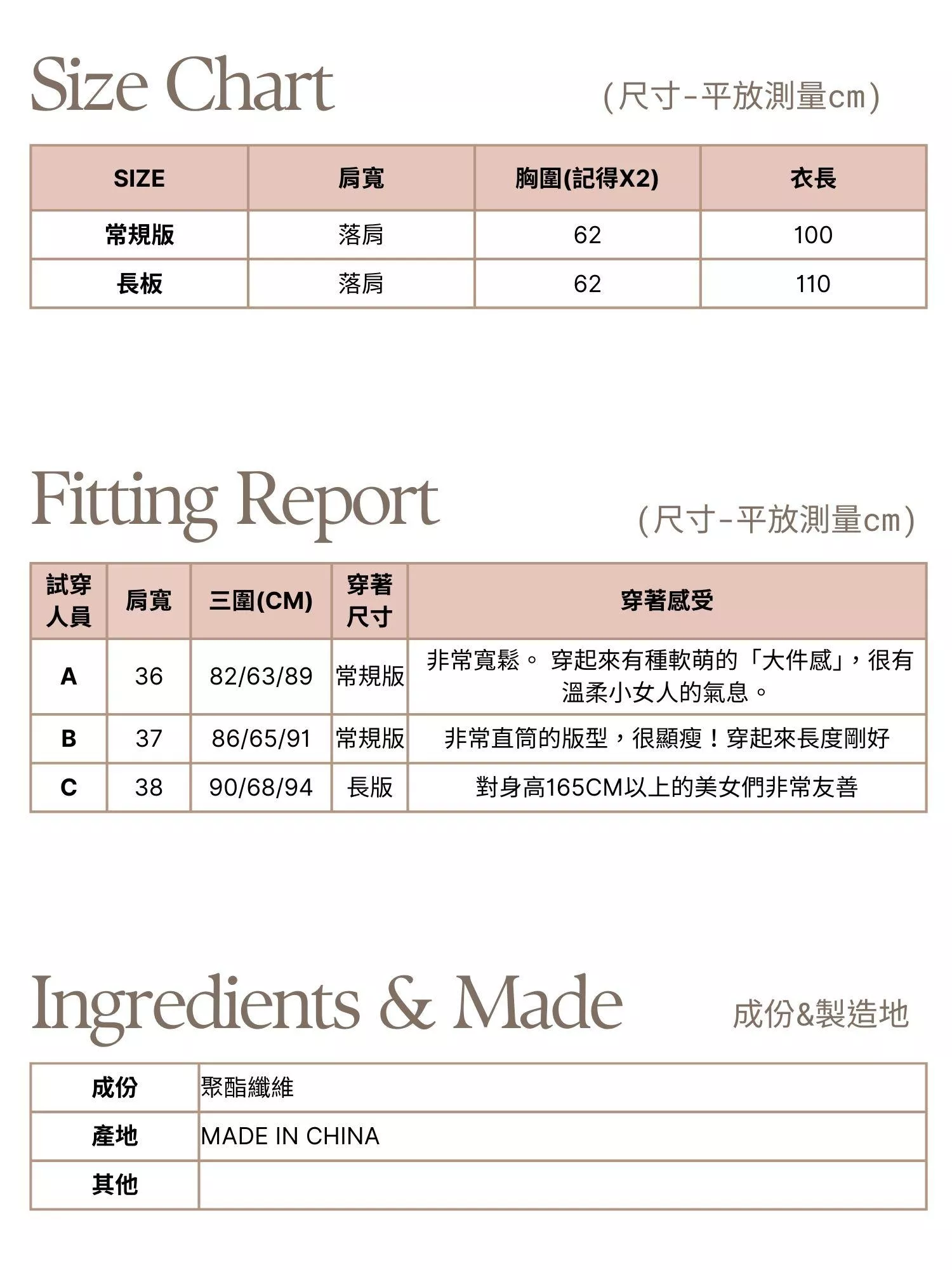 ◇常規 肩寬65 / 胸圍62 / 衣長100