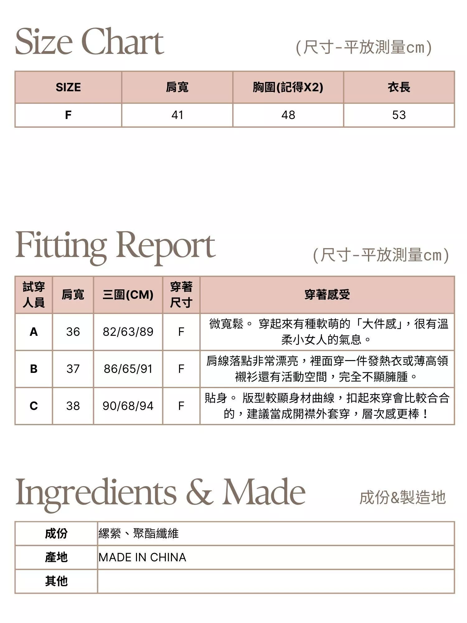 F Size: 肩寬 41 / 胸圍 48 / 衣長 53 / 袖長 56