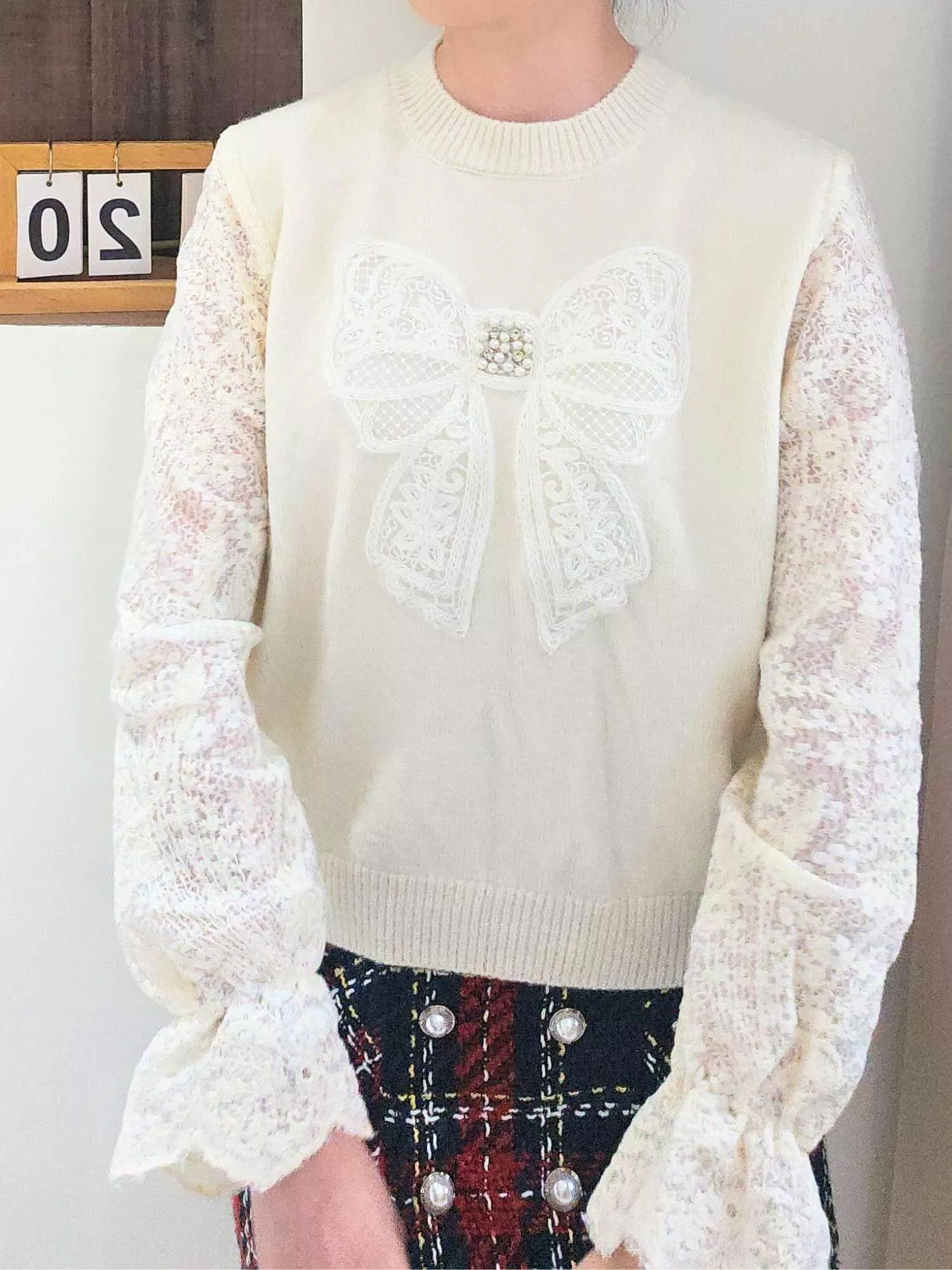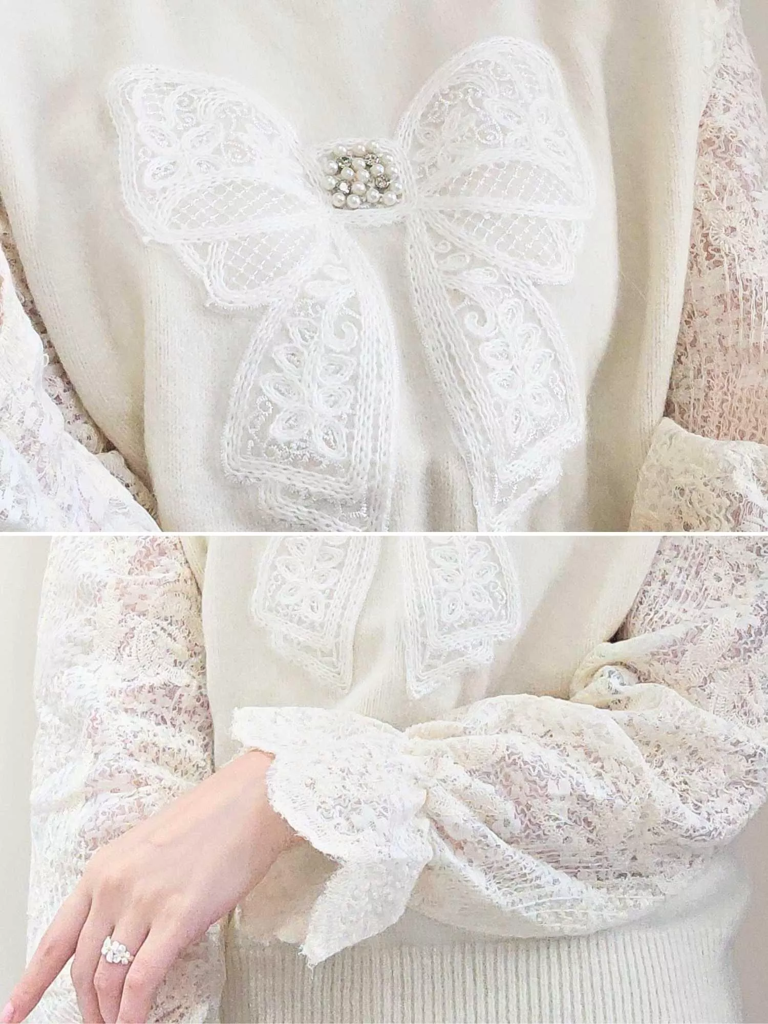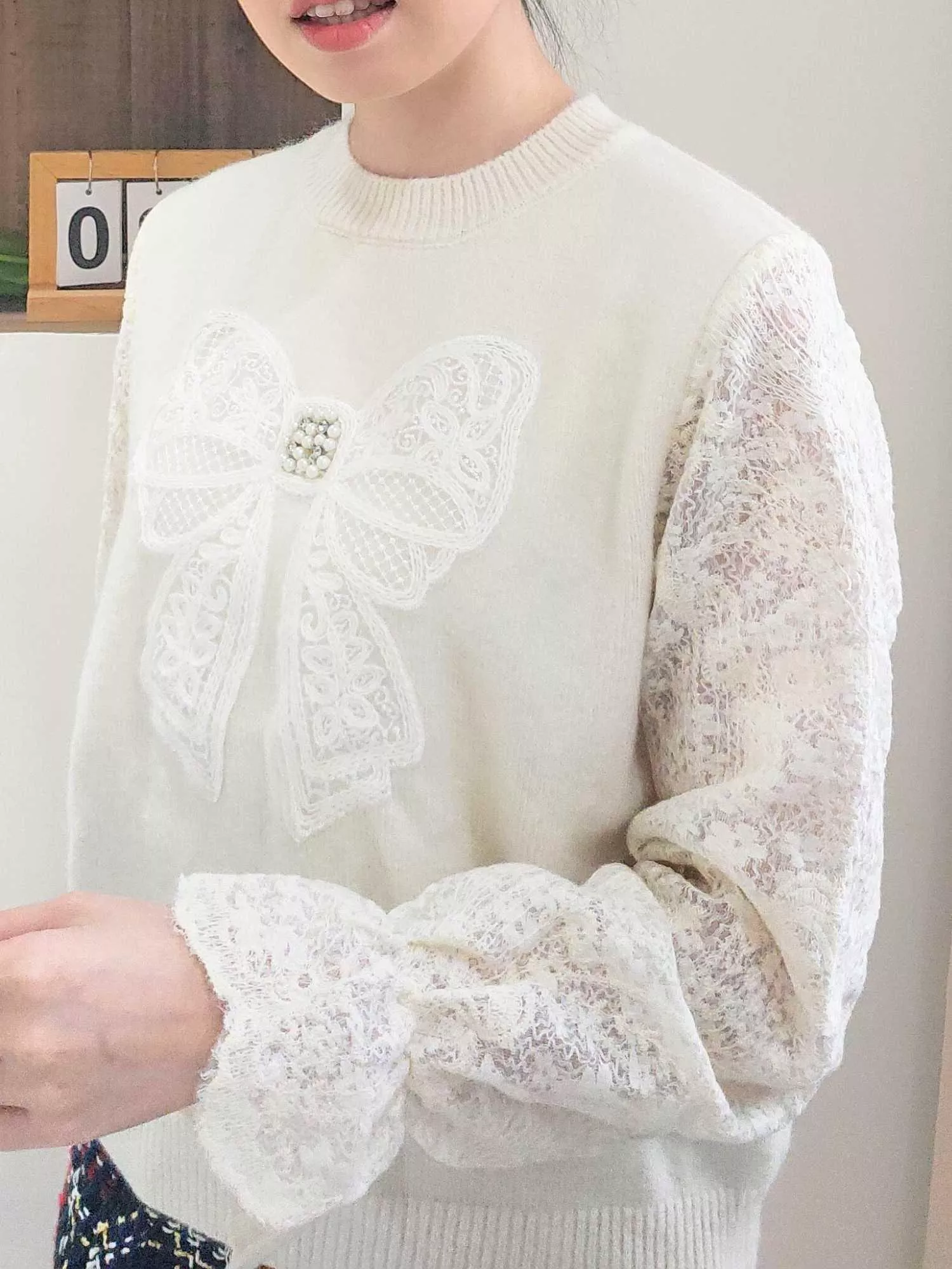 柔袖蝶戀蕾絲蝴蝶結針織上衣