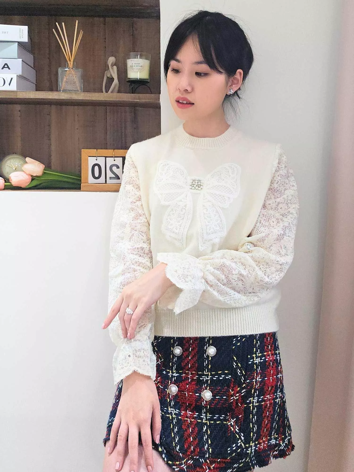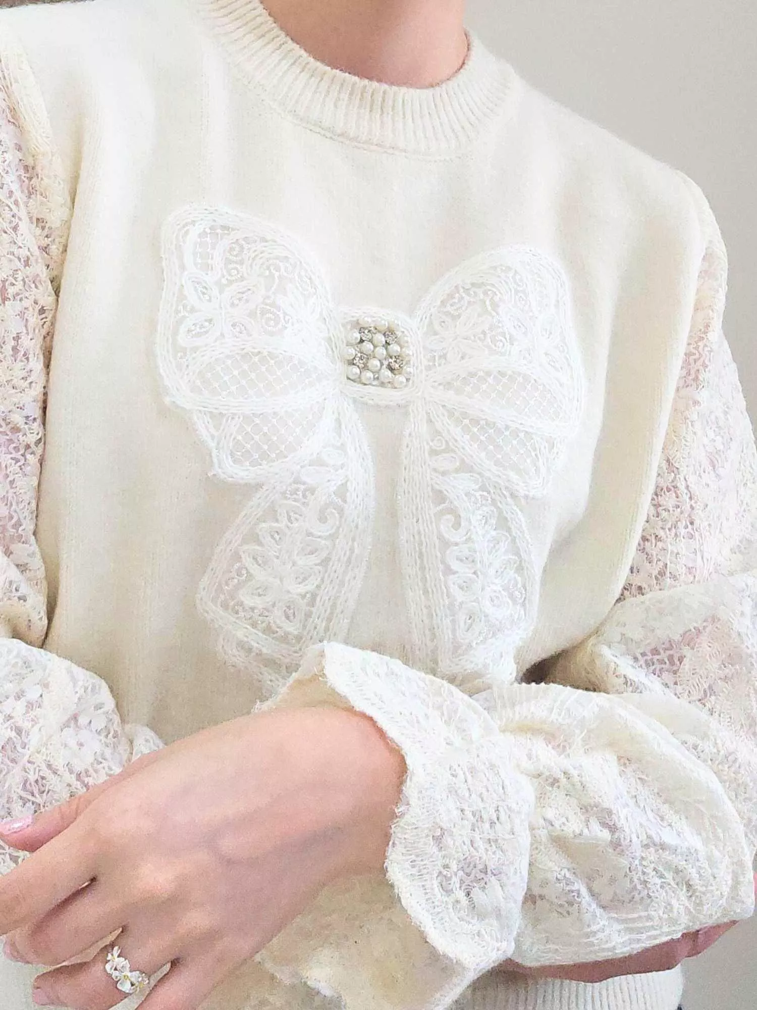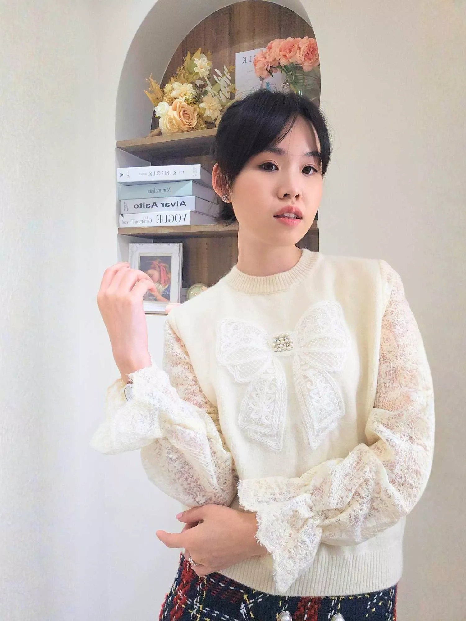柔袖蝶戀蕾絲蝴蝶結針織上衣
